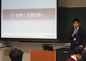 | 総合不動産ディベロッパー業界の理解を深めてもらうこと・就職活動に向けてより深く考えてもらうことを目的とし、開催しました。講師として東京建物(株)を招き、業界の紹介、また就職活動を控える学生に対してアドバイスをしていただきました。総合不動産ディベロッパー業界を学生に体感してもらえた、満足度の高い有意義なセミナーとなりました。 |