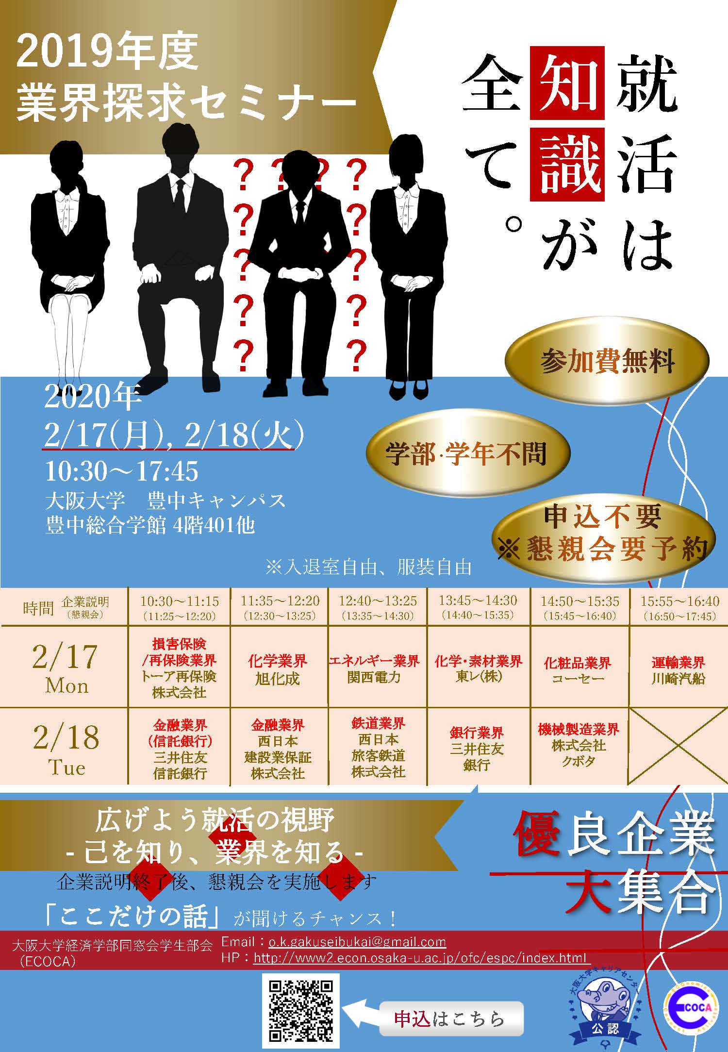 | 2/17(月)・ 2/18(火)の2日間、計11社の大手企業をお招きし、阪大生に向けた全学年対象の就活イベントを実施しました。セミナーは大人数での業界、企業についての説明会と、少人数での懇親会の2部制です。業界についての大まかな知識を得た後でより密な議論ができる場を提供することができ、企業、学生共に満足度の高いイベントとなりました。 |