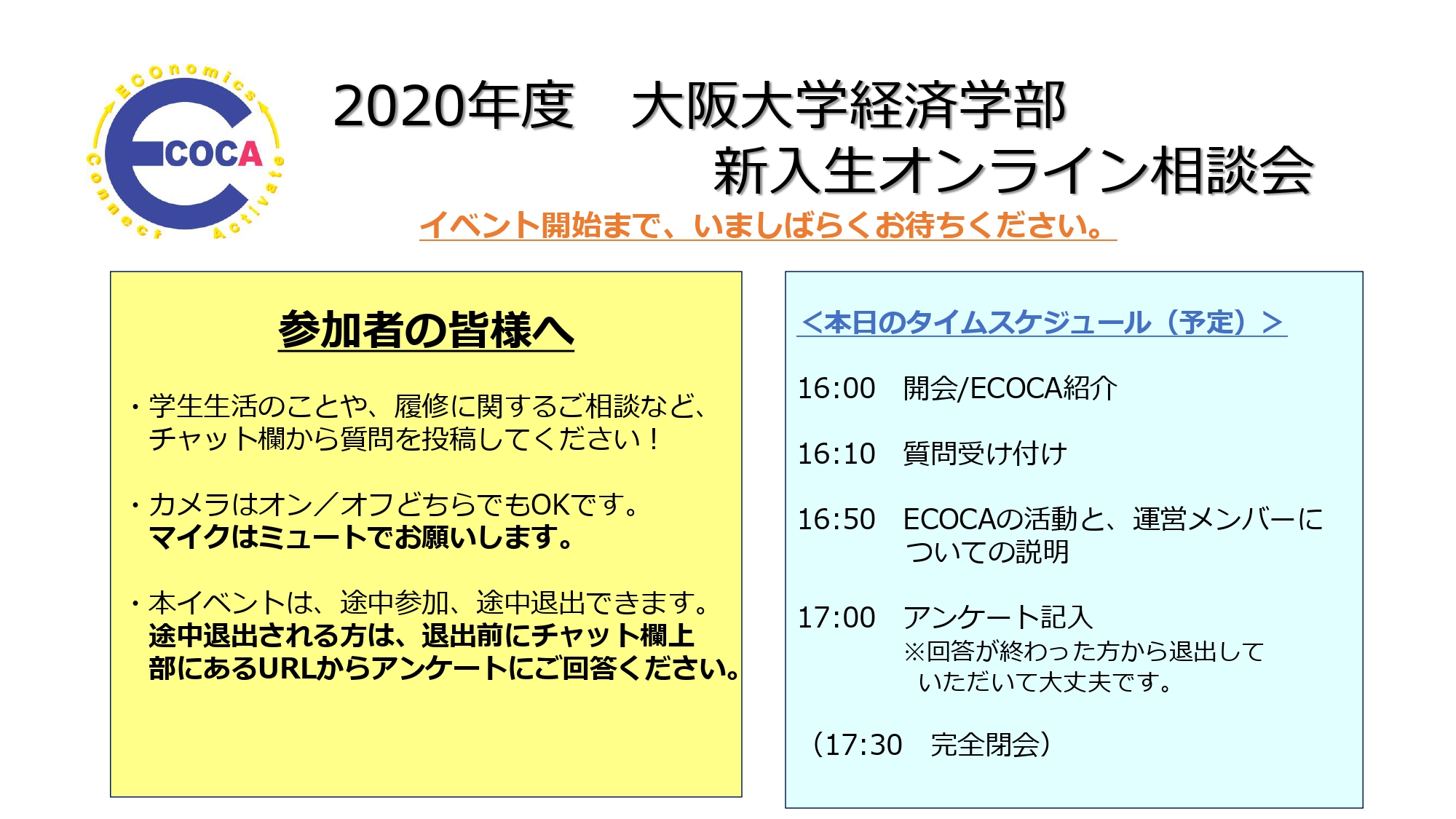 | 2020年度に入学した経済学部新入生向けのオンライン相談会です。大学に来る機会が減っている中で、学生生活や学部での講義などについて新入生が抱く疑問を一緒に解決できればと思い、開催しました。当日は履修の方法や講義内容などについての質問が多く寄せられ、スタッフがこれまでの経験を活かして回答しました。しっかりと的を射た回答ができるか不安でしたが、参加者の皆さんの反応も良く、新入生の悩みを解決するという当初の目標が達成できたのではないかと感じています。 |