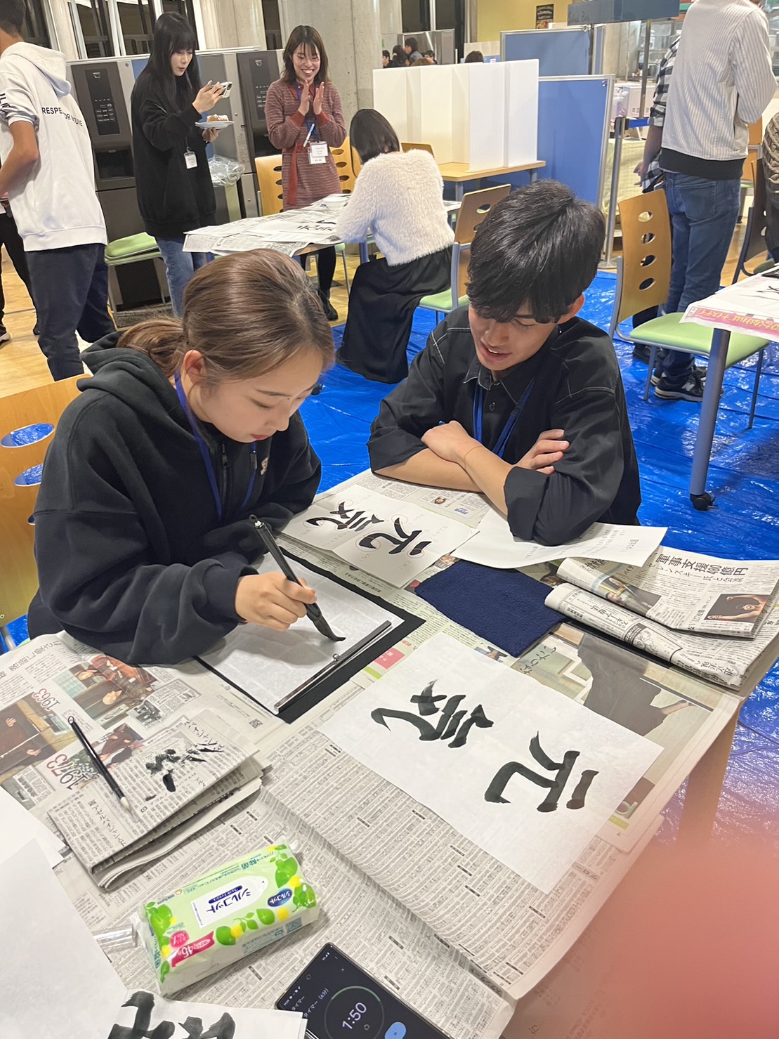 習字体験の様子です。 留学生はECOCAスタッフのアドバイスのもと「元気」を書き上げました。 |